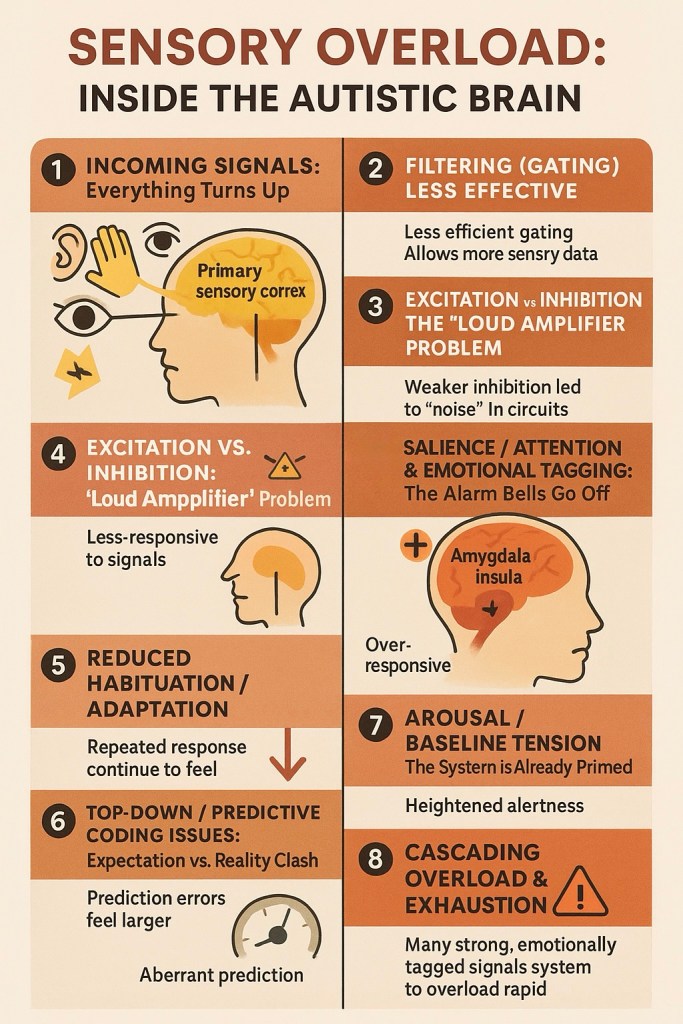 During overload, incoming sights/sounds/touch are amplified by hyper-excitable sensory cortex (E/I shift), flagged as urgent by the amygdala/insula and thalamus (salience + gating), don’t habituate as quickly, and land on a system with higher baseline arousal; meanwhile the brain’s predictive filters treat differences between expectation and reality as bigger than usual. The combined effect is a rapid climb in intensity and stress that’s hard to damp down.