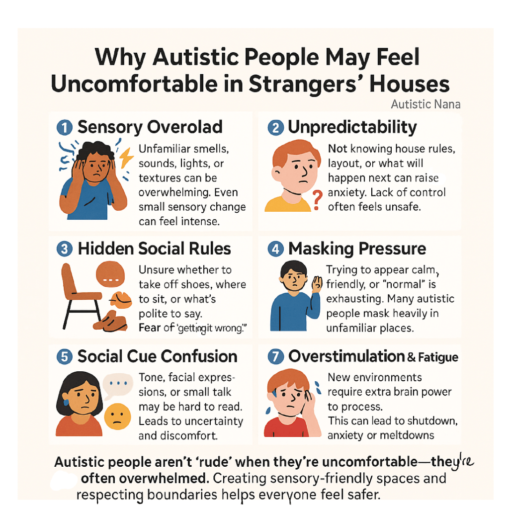 - Being in someone else’s home often increases the need to “mask” — to act “normal,” smile, make eye contact, or appear at ease.