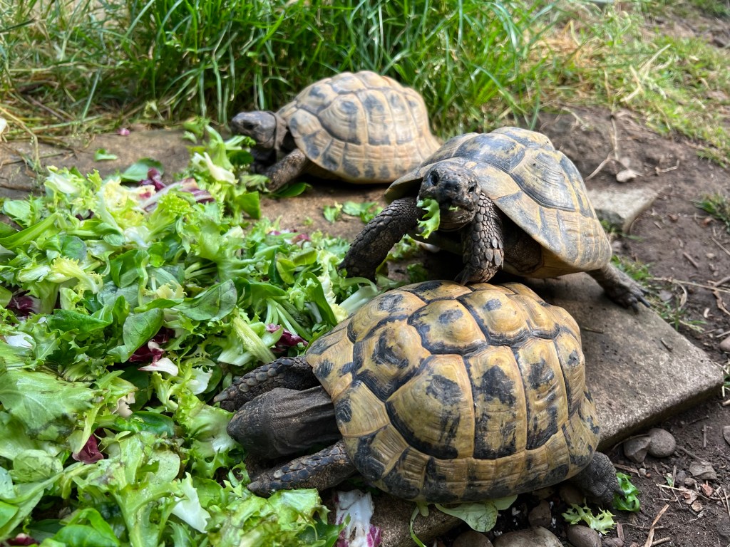 I have tropical fish, a nature pond (currently full of fat tadpoles), two dogs, five different species of tortoises, neocaridina shrimp and mystery snails.